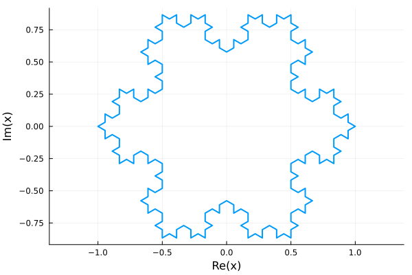 global v = vcat( [koch(v[k], v[mod(k, n) + 1]) for k in 1:n]... );