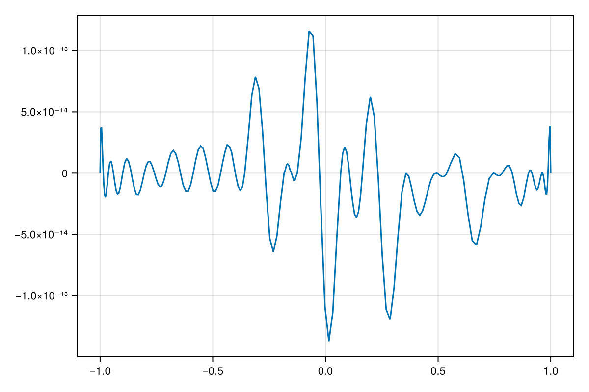 -6.38378239159465e-16We see that this approximation is accurate to about 13 places over the interval: