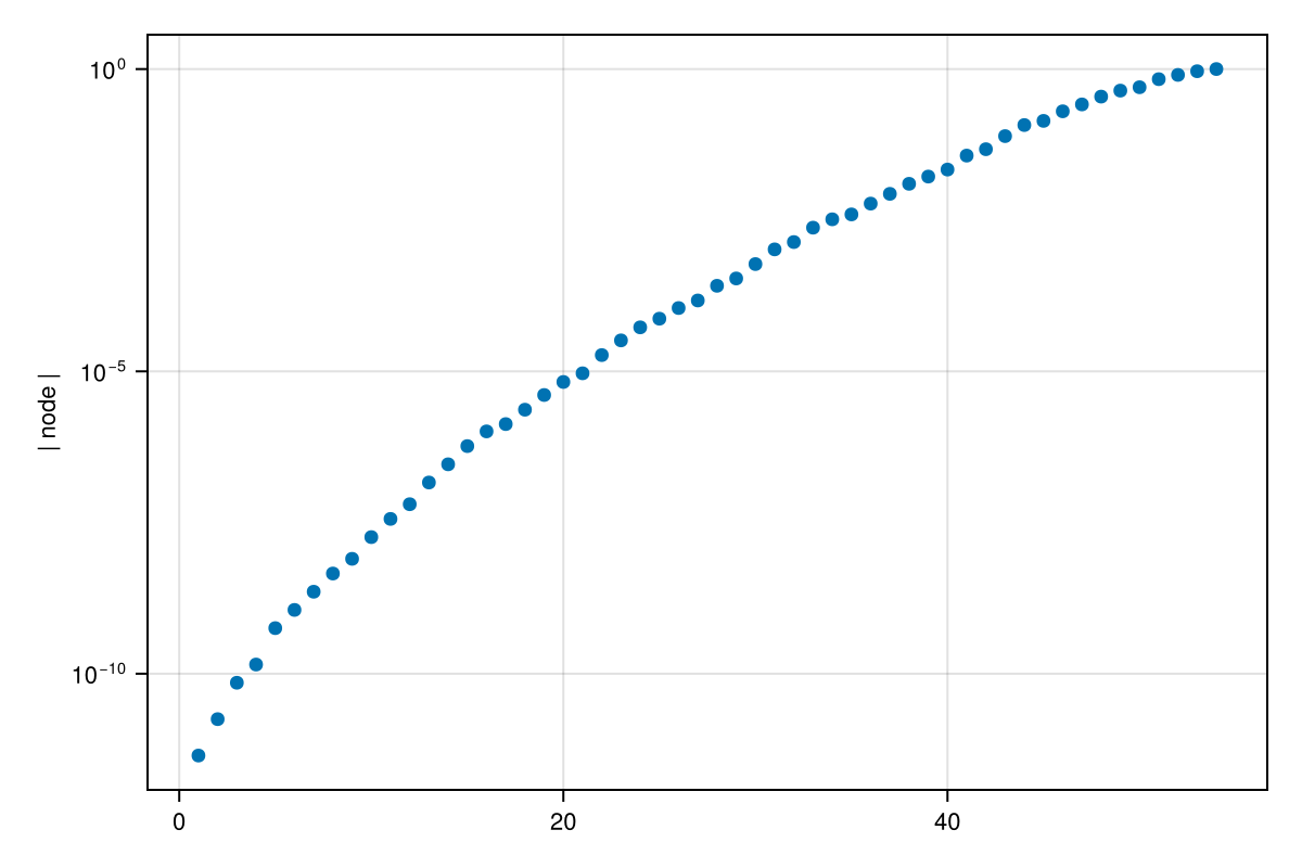 scatter(sort(abs.(z)), axis=(ylabel="| node |", yscale=log10,))