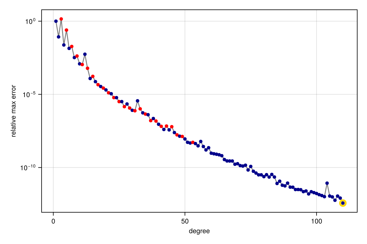 Barycentric{Float64, Float64} rational of type (50, 50) constructed on: Segment(-2.0,4.0)Note that the degree of the rational approximant increased to capture the additional complexity.