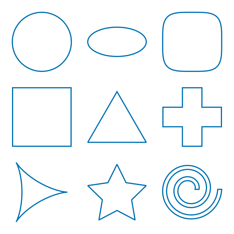 ax, _ = lines(fig[i, j], shapes[i, j], linewidth=2, axis=(autolimitaspect=1,))