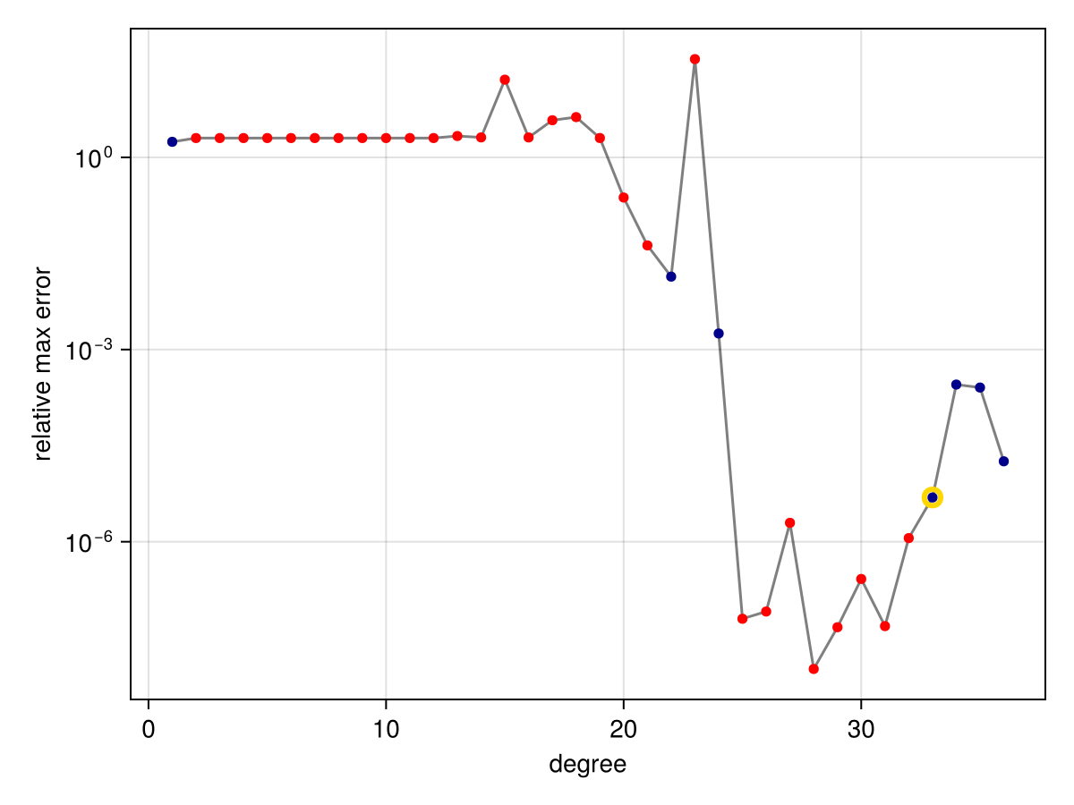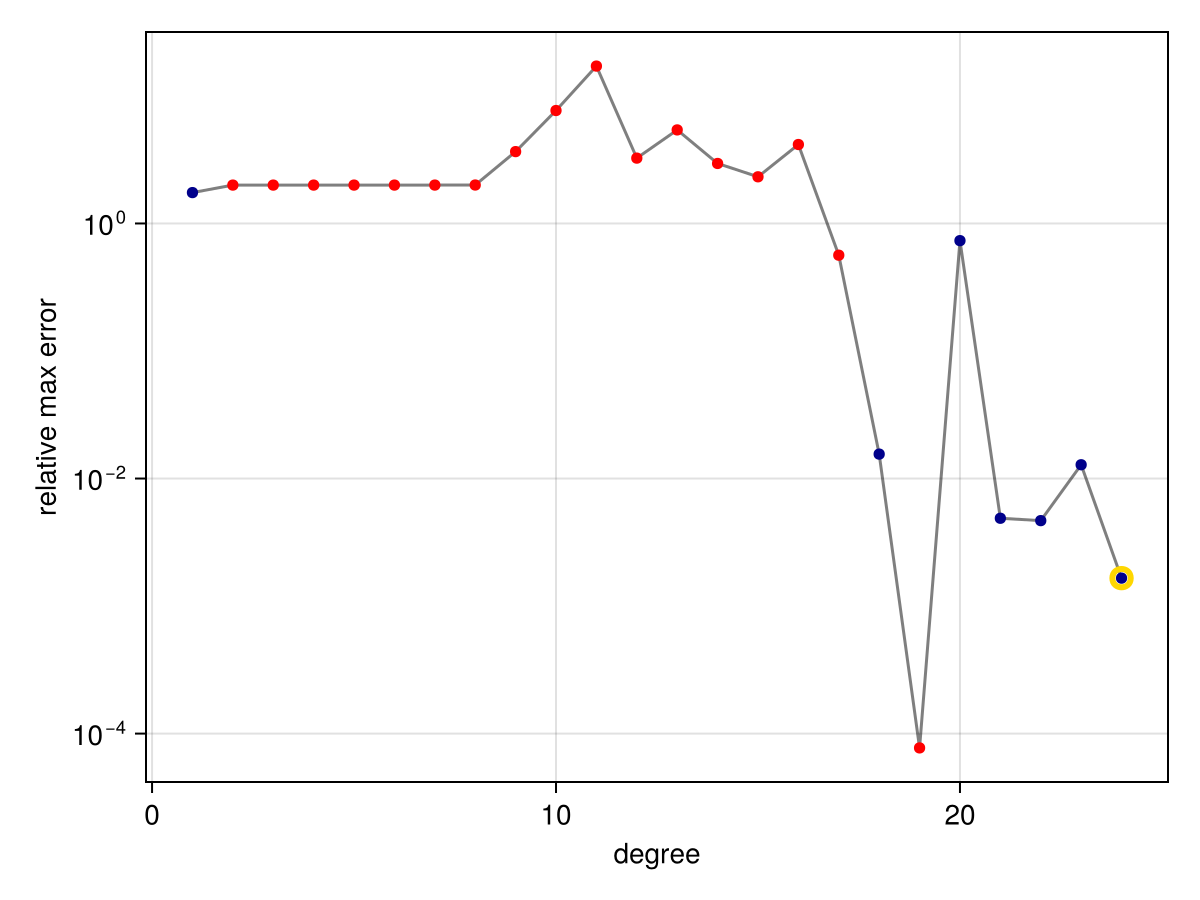 Max error: 1.1823868189470135e-5@elapsed r = approximate(f, unit_interval; method=Thiele, max_iter=300, allowed=true)