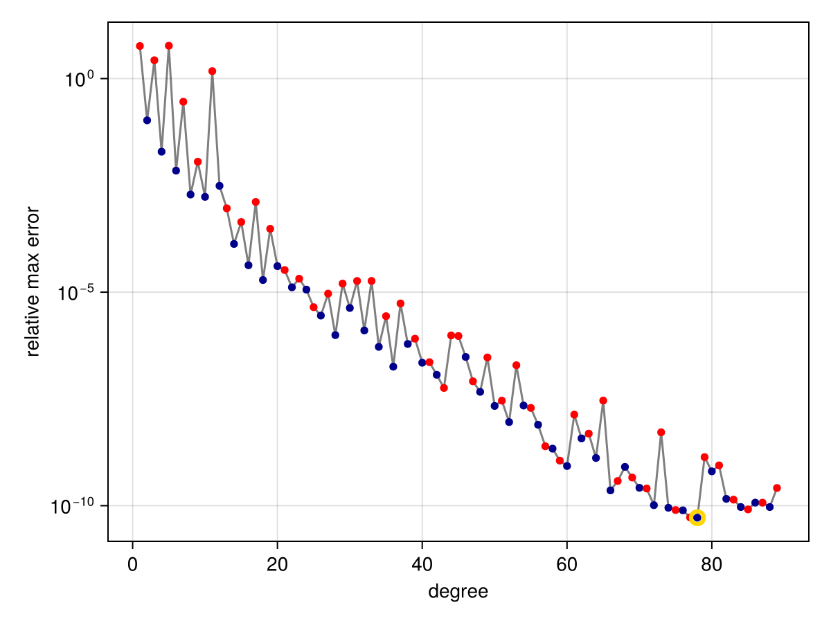 max_err(r);Max error: 1.9844602135998812e-5To get greater accuracy, we can increase the degree of the polynomial part.