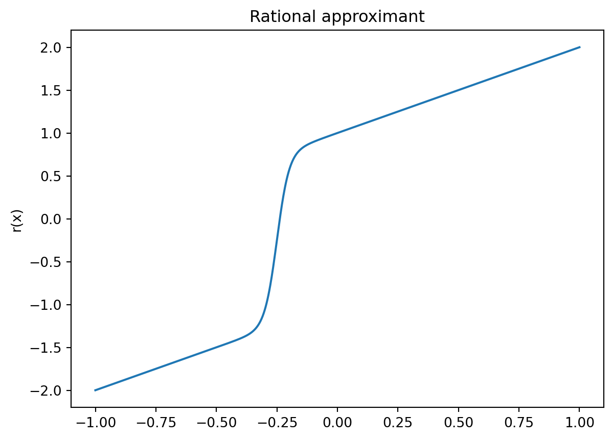 from pyratapprox import approximate, unitintervalimport numpy as npdef f(x):return x + np.tanh(20* (x +0.25))r = approximate(f, unitinterval)print("Approximant of rational type", r.degrees())