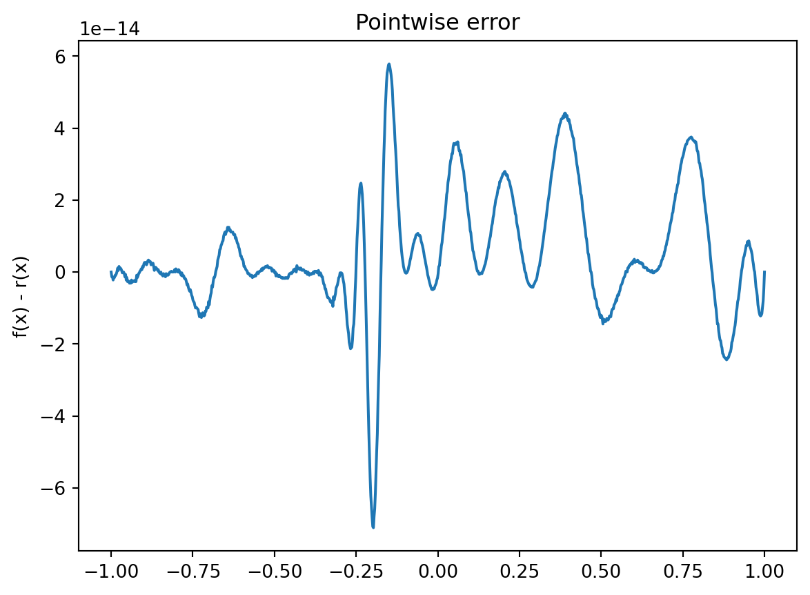 import matplotlib.pyplot as pltplt.plot(x, f(x) - r(x))plt.ylabel('f(x) - r(x)')plt.title('Pointwise error');